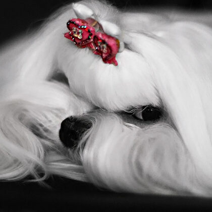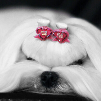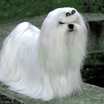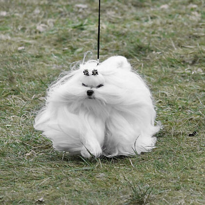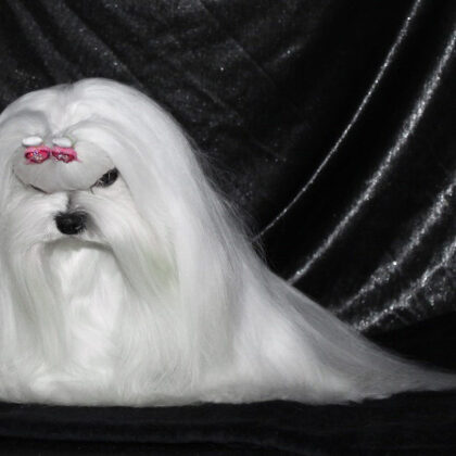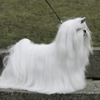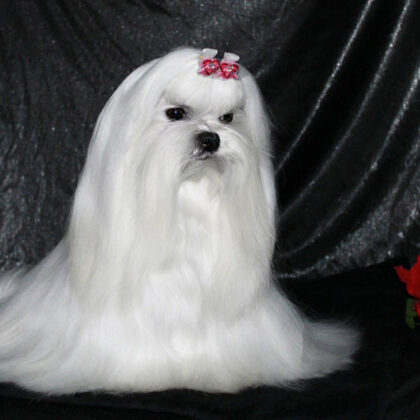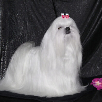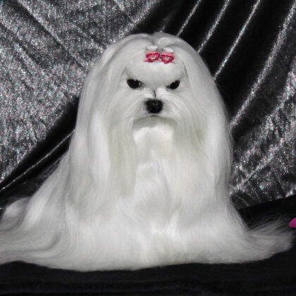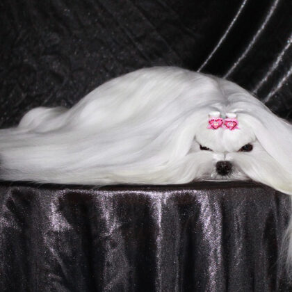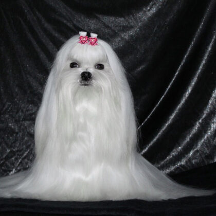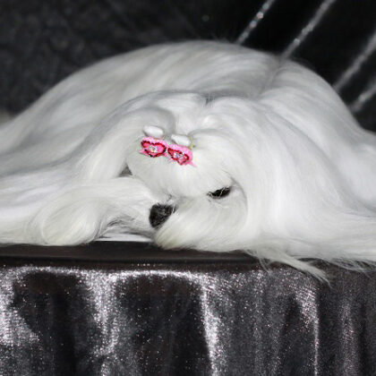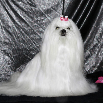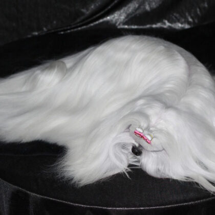Naše překrásná Chloe má bezchybnou srst, extra rychle rostoucí, naprosto rovnou, vynikající pigment a neskutečně krásnou hlavu s kraťounkým nosánkem. Výstavy ji moc nebavily, ale i tak vítězila. Je představitelkou "korejského typu" maltézáčka.